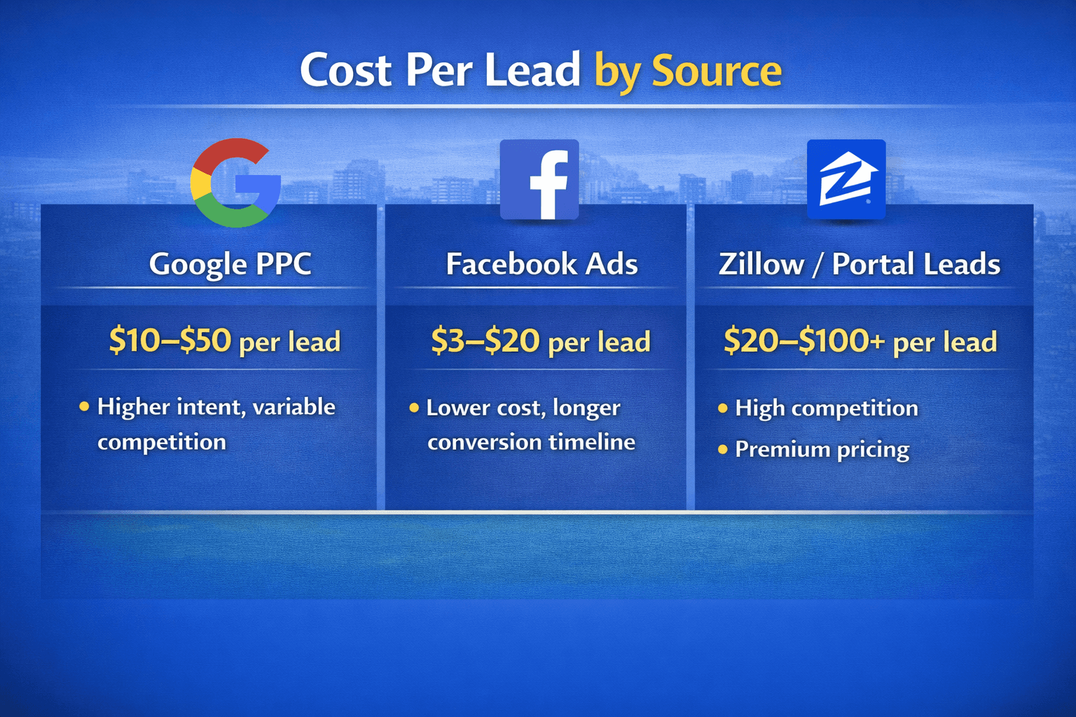 Real estate lead generation costs vary widely depending on the source, and understanding cost per lead alongside monthly budget requirements is critical for setting realistic expectations, because different channels produce different pricing structures, volumes, and timelines, which means agents need to evaluate both upfront spend and long-term cost per closing when choosing how to generate leads.