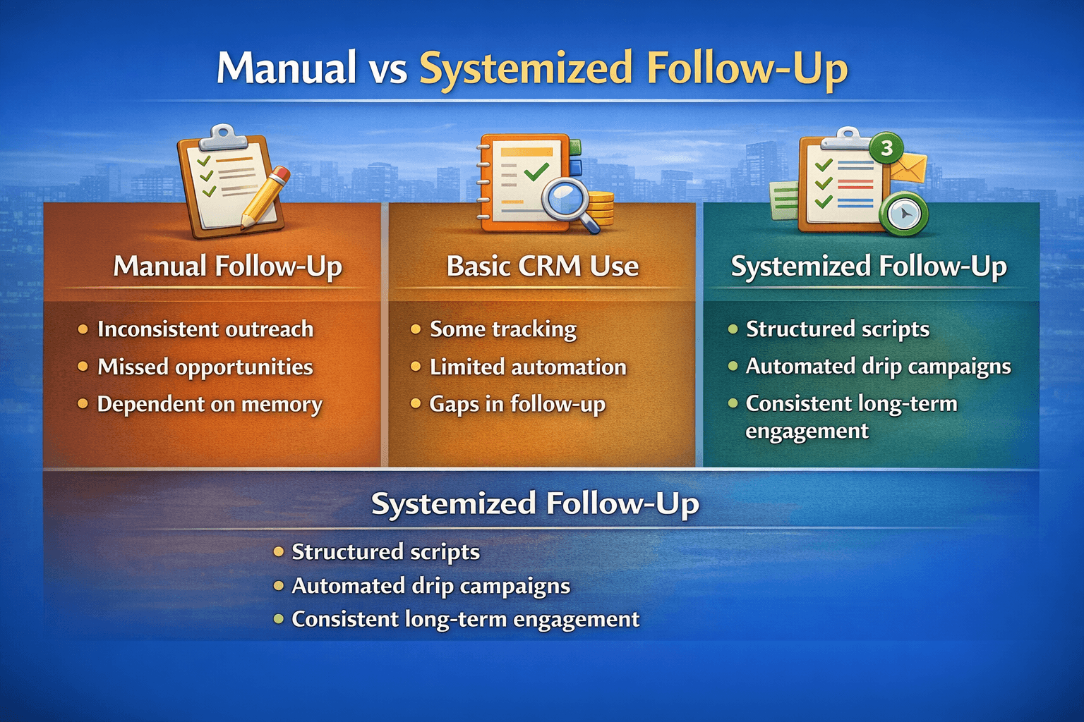 A complete follow-up system combines immediate scripts for first contact, automated drip campaigns for ongoing communication, and CRM workflows that track and trigger actions, where scripts ensure consistent messaging, drip campaigns maintain presence over days and weeks, and CRM workflows organize timing and prevent missed follow-ups, creating a system where no lead is forgotten and every opportunity is worked until it converts or clearly drops off.