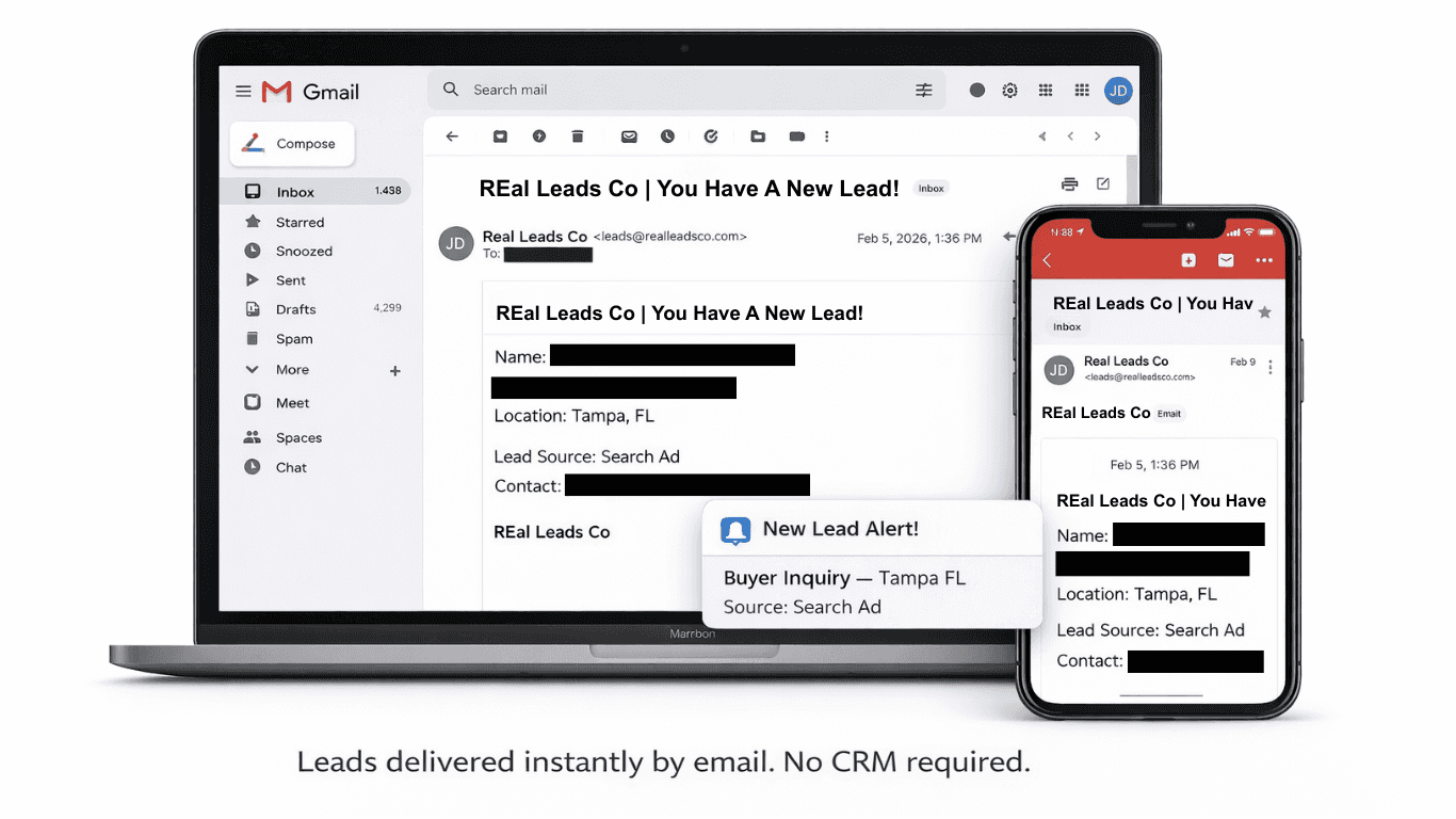 With Real Leads Co, buyer inquiries are delivered instantly by email. Each inquiry typically includes the buyer’s contact information, location ZIP code, and the marketing source that generated the lead. Because th