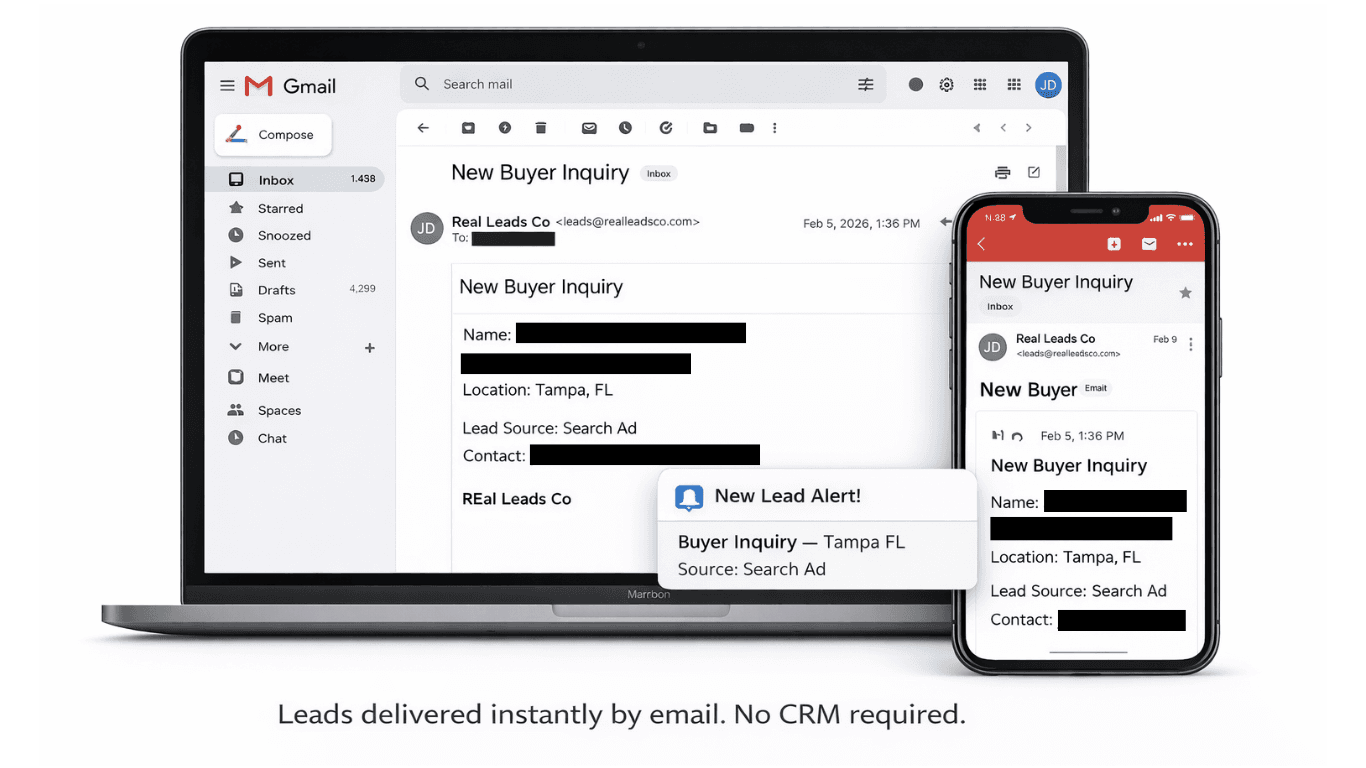 With Real Leads Co, buyer inquiries are delivered instantly by email. Each inquiry typically includes the buyer’s contact information, location ZIP code, and the marketing source that generated the lead. Because th