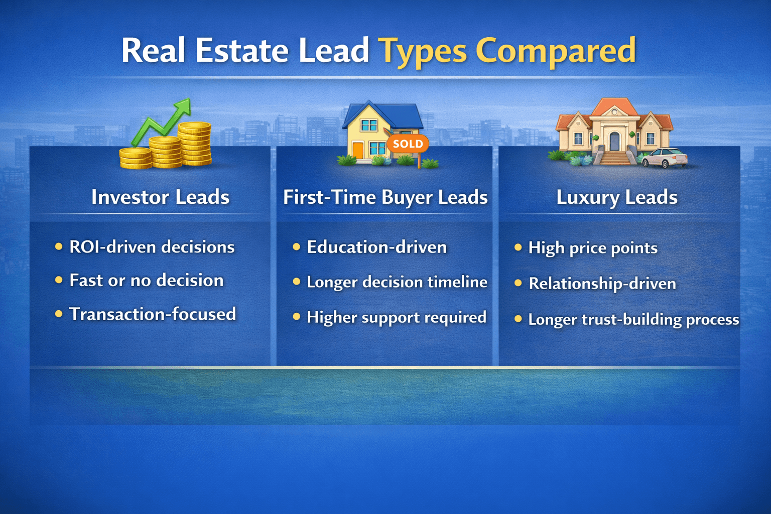 Not all real estate leads behave the same, and understanding the differences between investor leads, first-time buyer leads, and luxury leads is critical for setting expectations and improving conversion, because each type has different timelines, motivations, and follow-up requirements, which means success comes from matching your approach to the lead type rather than treating every inquiry the same.