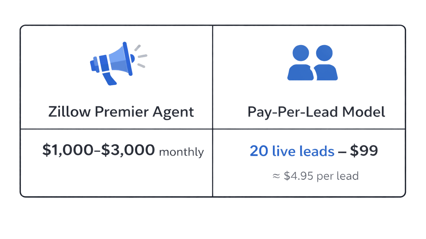 Zillow leads typically cost agents between $1,000 and $3,000 per month depending on ZIP code competition. The platform sells advertising placement inside specific markets, meaning agents often commit to monthly budgets before seeing consistent results. Because of this, many agents compare Zillow with lower-cost pay-per-lead alternatives.